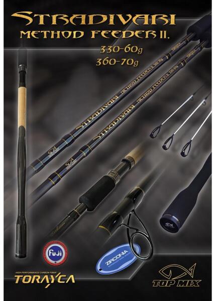 TOP MIX Stradivari Method Feeder II 360 70g feederbot A tovább fejlesztett Stradivari method feeder II botok az elődjeikhez képest nagy különbséget nem mutatnak, mégis pár apró részletben magasabb minőséget képviselnek. A botok anyaga magas minőségű 40T carbon lett. Változott a nyélkialakítás formája is, ergonomikusabb lett. A felhasznált anyag kiváló tulajdonságai teszik a botot könnyűvé, feszessé és nagyon kezessé. A botok kialakításánál nagy figyelmet fordítottunk arra, hogy élmény legyen vele a horgászat, minimálisra csökkenjen a halvesztés lehetősége. A botoknak van elejük a fárasztáshoz, megfelelően erős gerincük a pontos és a hosszabbaknál a nagy távolságú dobásokhoz. Kategóriájukban a legkönnyebbek közé tartoznak, így kényelmessé teszik a horgászatot. A legfinomabb 3,30 és 3,60-as botok egytalpas emelt, míg az erősebb 3,90 és 4,20-as kéttalpas, a mai elvárásnak megfelelő magas minőségű SeaGuide Zirconia gyűrűkkel szereltek. A botok felülete nyerscarbon , míg a feliratok alatt fényes lakk kiképzést kapott. A nyél hossza kényelmes botkezelést, míg anyaguk, EVA és parafa kombinációja, kellemes fogást biztosít. A nyélen természetesen horogakasztó is található. A spiccek hármas támaszú spiccgyűrűket kaptak, így nem hajolnak el és dobáskor is kisebb lesz a felcsavarodás, ezzel együtt pedig a spicctörés lehetősége.